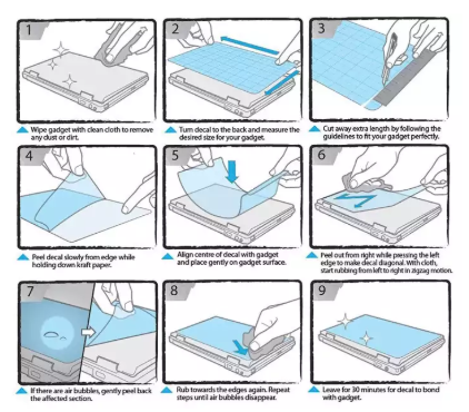 • 1. Make sure your laptop is clean. Wipe it off with a soft cloth. The laptop should be free of dust, fat or grease - otherwise the laptop skin may not stick to your laptop as well as it's supposed to.