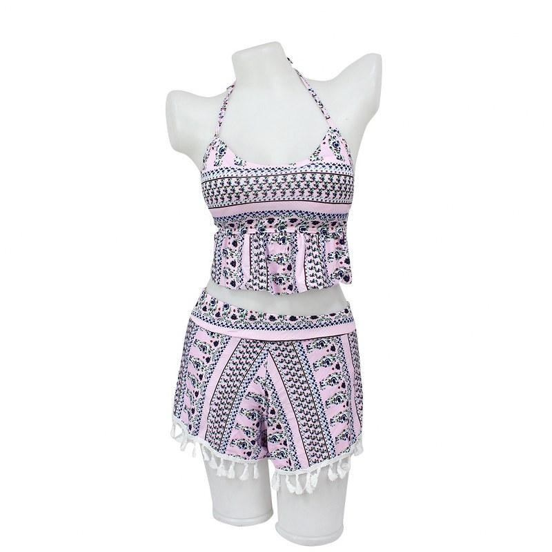 Product detail of Pink Printed Halter Neck Top and Bottom Swim Set For Women