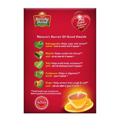 • Red label natural care contains tulsi which as per Ayurveda texts helps build body resistance and mulethi which helps soothe the throat